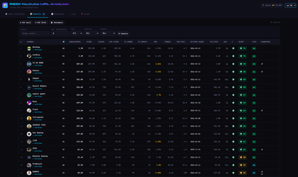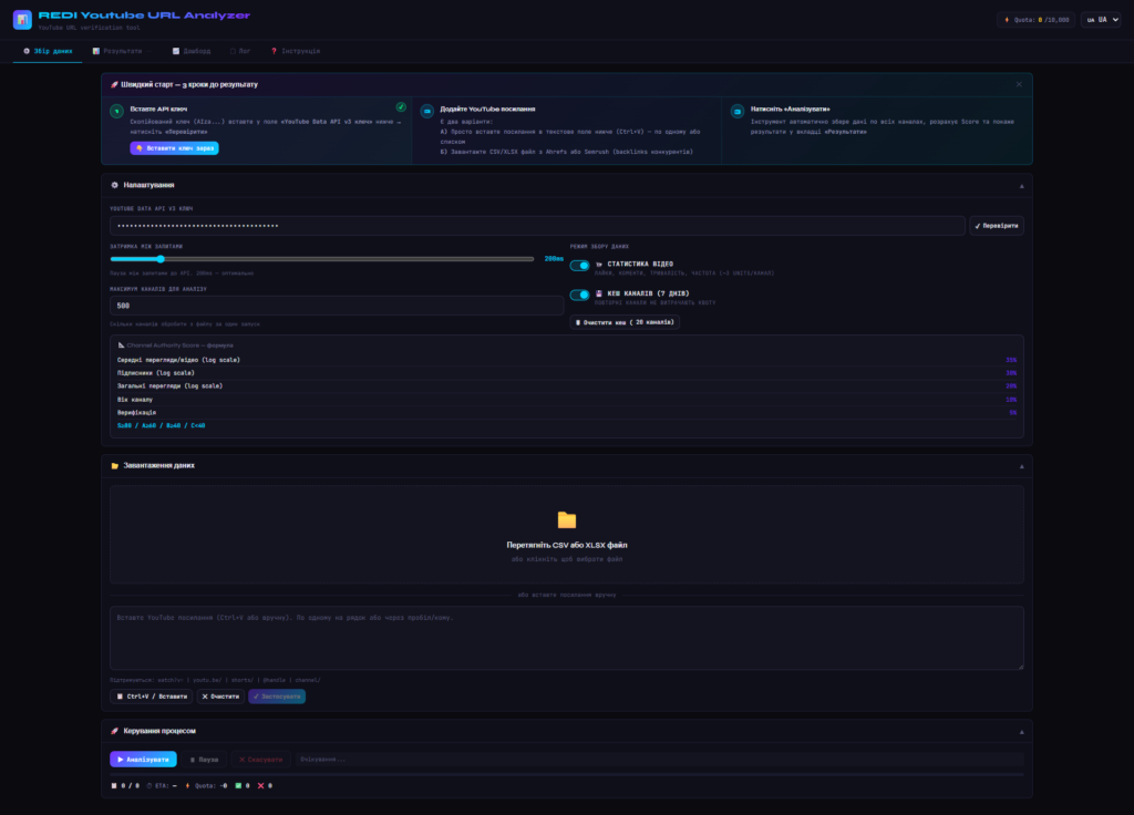 Checking dozens or hundreds of channels manually is inefficient. That is why we built a YouTube Channel Analyzer – a tool designed to automatically collect YouTube channel statistics and help identify the most valuable channels for outreach, collaborations, marketing campaigns, and SEO research.