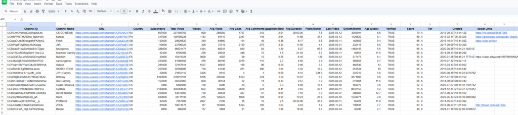 Instead of manually opening each channel and collecting metrics, the tool automatically gathers key information and organizes it into a structured dataset.